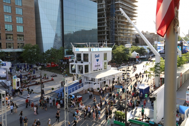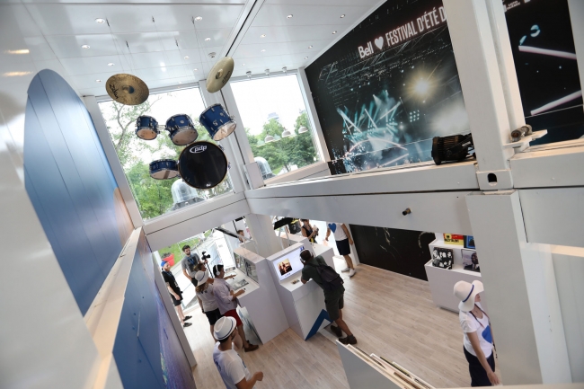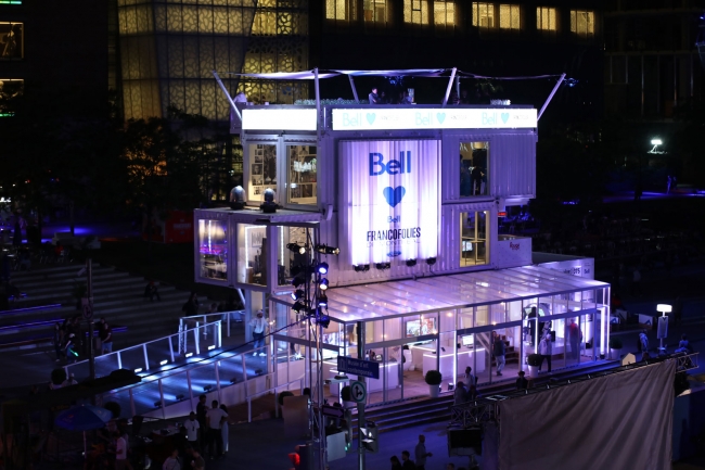 Bell was at the Francofolies de Montréal from June 8th through 18, enjoying enormous success right in the heart of the entertainment quarter. A recording studio was set up in the Bell Pavilion and four musical artists were invited to compose and record a song that was broadcast live on the Web. The public was invited to explore the different spaces, take part in several activities, see tech demos in a glassed-in space connected to the main structure and climb onto the unit’s top deck for an unforgettable view of the main stage. All in all, a huge hit!