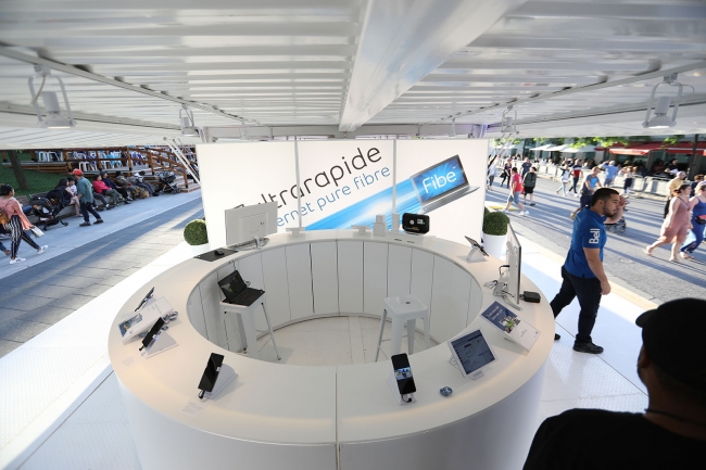 In the Split 40, the public was free to explore the space and take part in experiential activities and tech demos for Bell and La Source products. Measuring an imposing 16 feet tall by 40 feet wide, with a 40-foot screen installed on the roof, the unit was visible from a great distance.