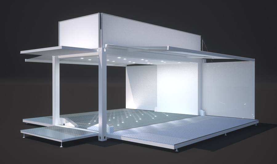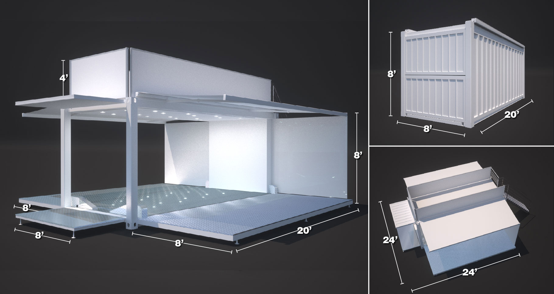 Fully modular, this unit measures 8 X 20 feet closed and a spacious 24 X 24 feet open. Full 16 X 9 foot rooftop billboard for maximum brand visibility OR VIP deck with railings and stairs. Modern look with white finish and checker plate floor. This mid-size first generation Loki Box sets all the standards for impact and mobility.
