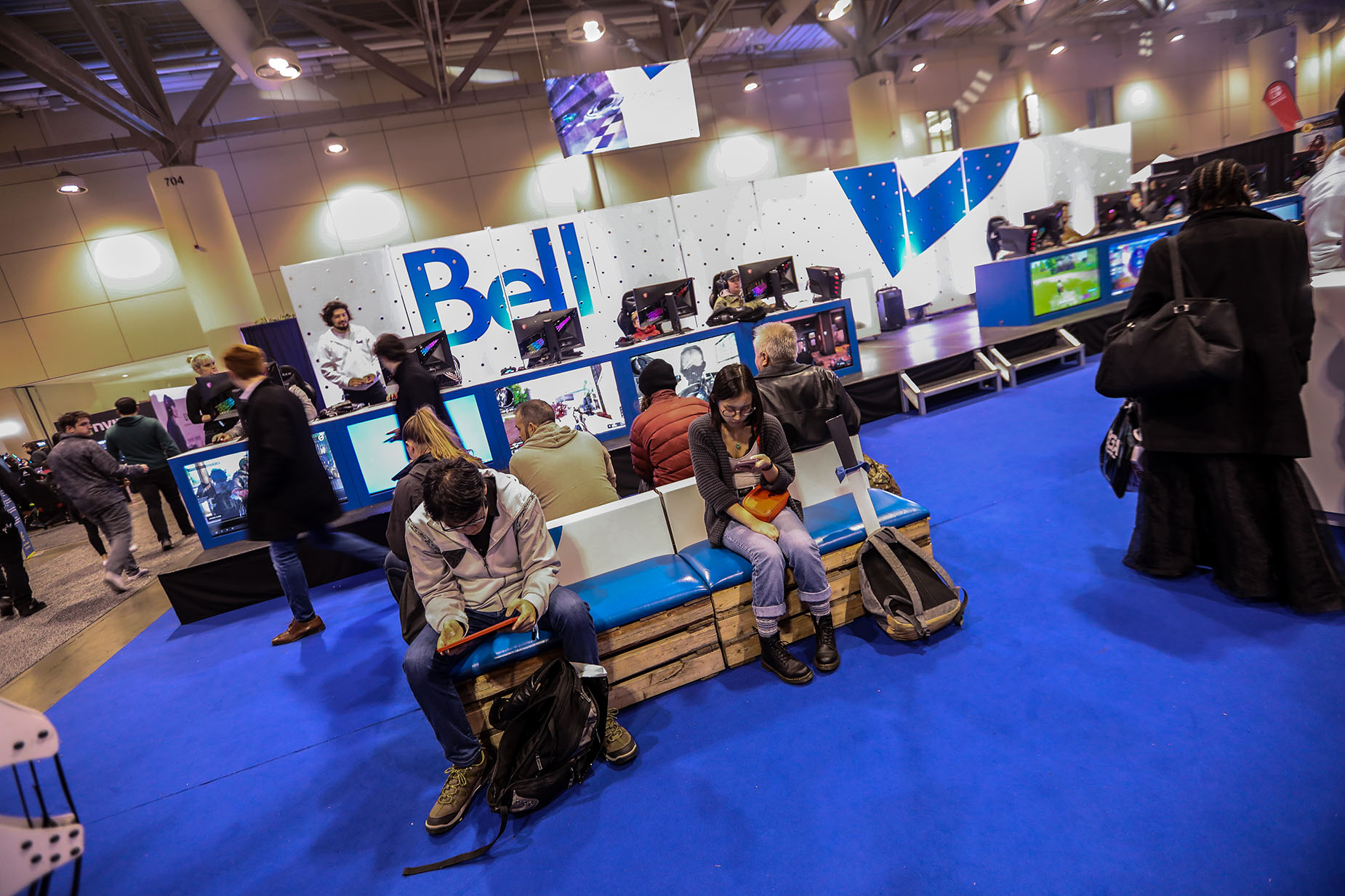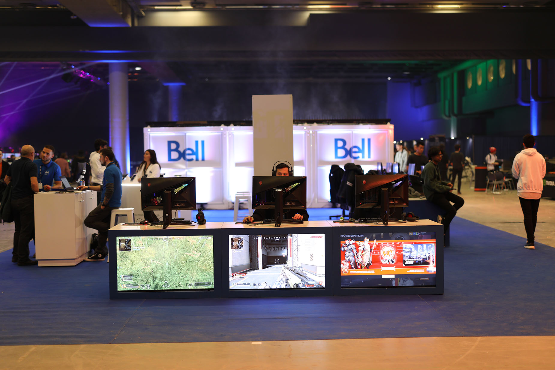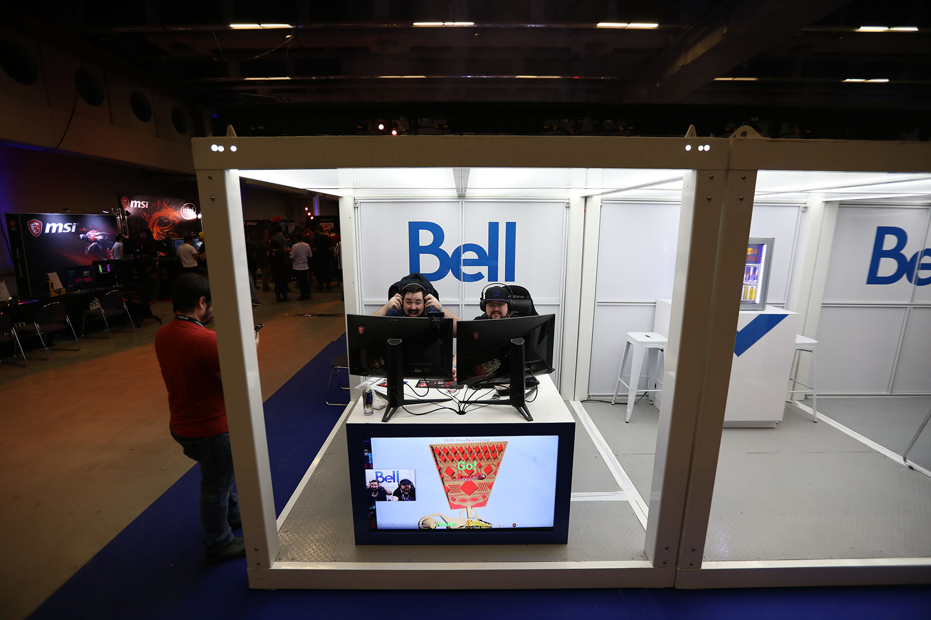 The Bell brand occupied centre stage on the tournament floor, with a demo booth for its mobile phones built by Loki Box Design at one end of a giant blue carpet that defined the Bell zone. Gamers could also give the cocoon-like Loki Cube a whirl for a more intimate, immersive place to play secluded from the very crowded main room.