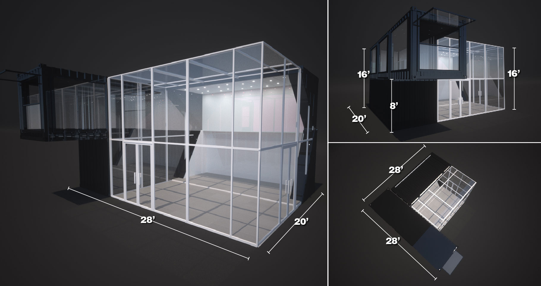 With a private entrance yet expansive second floor fenestration, this specialized VIP unit balances the needs for privacy and visibility for important guests. Cantilevered viewing terrace offers a unique vantage point over a festival or convention floor. 8X20 footprint on the ground, 8X28 in the air. In basic black that makes a statement.