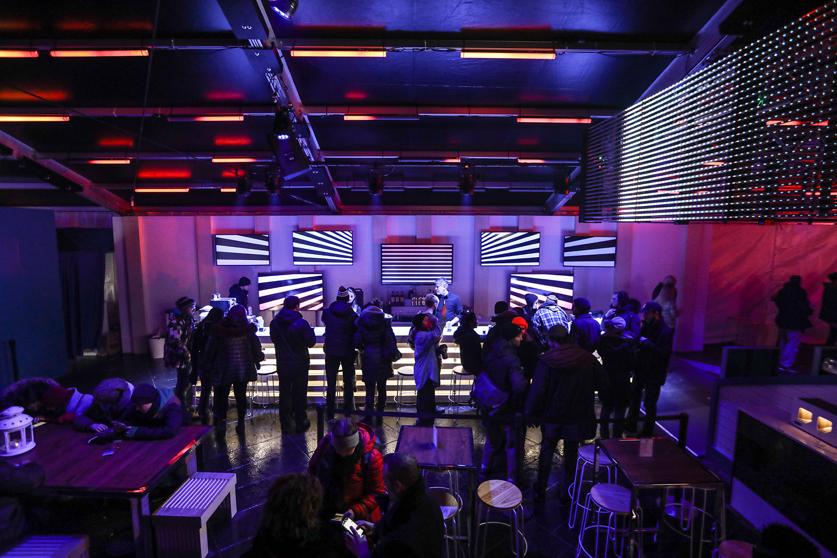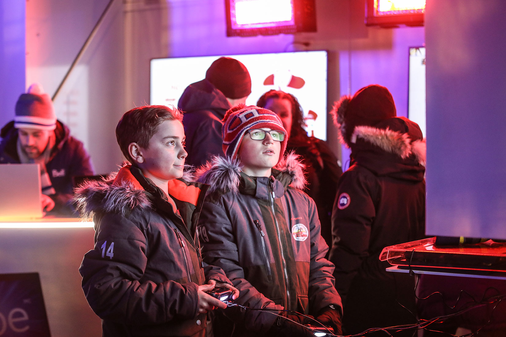 The pop-up Bell Chalet, a large central gathering pavilion complete with games, bars and big screen TVs, continues to be a popular festival fixture and focal point year after year. Bell also deploys a Loki Box Design Split 20 unit, with its unique diagonal hinge structure and full 16-foot display height, as an attractive satellite pop-up container booth where visitors could play a Montreal Canadiens video game. Other festival amenities made possible by Bell include an exterior slide, a very welcome fire pit and phone recharging stations.