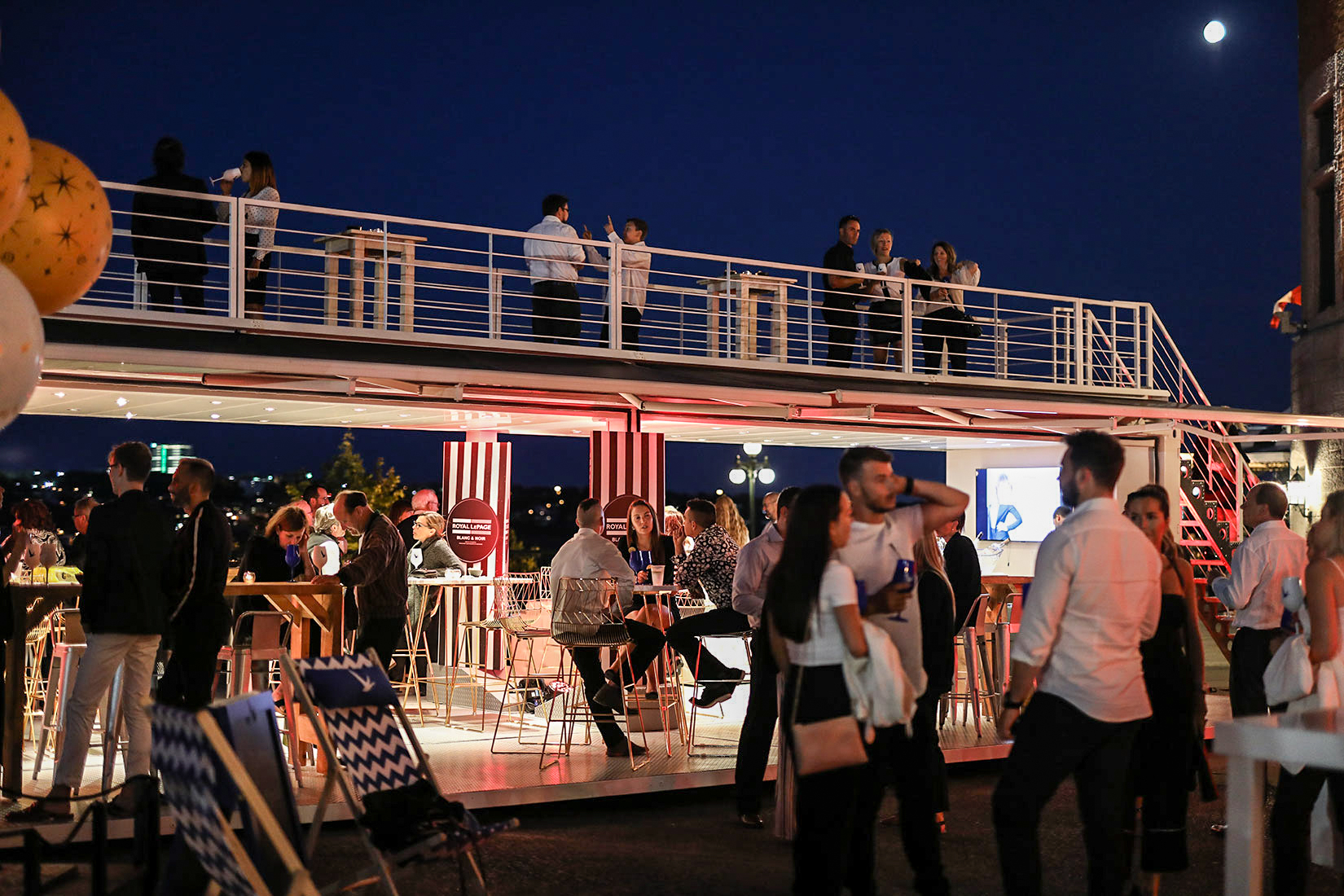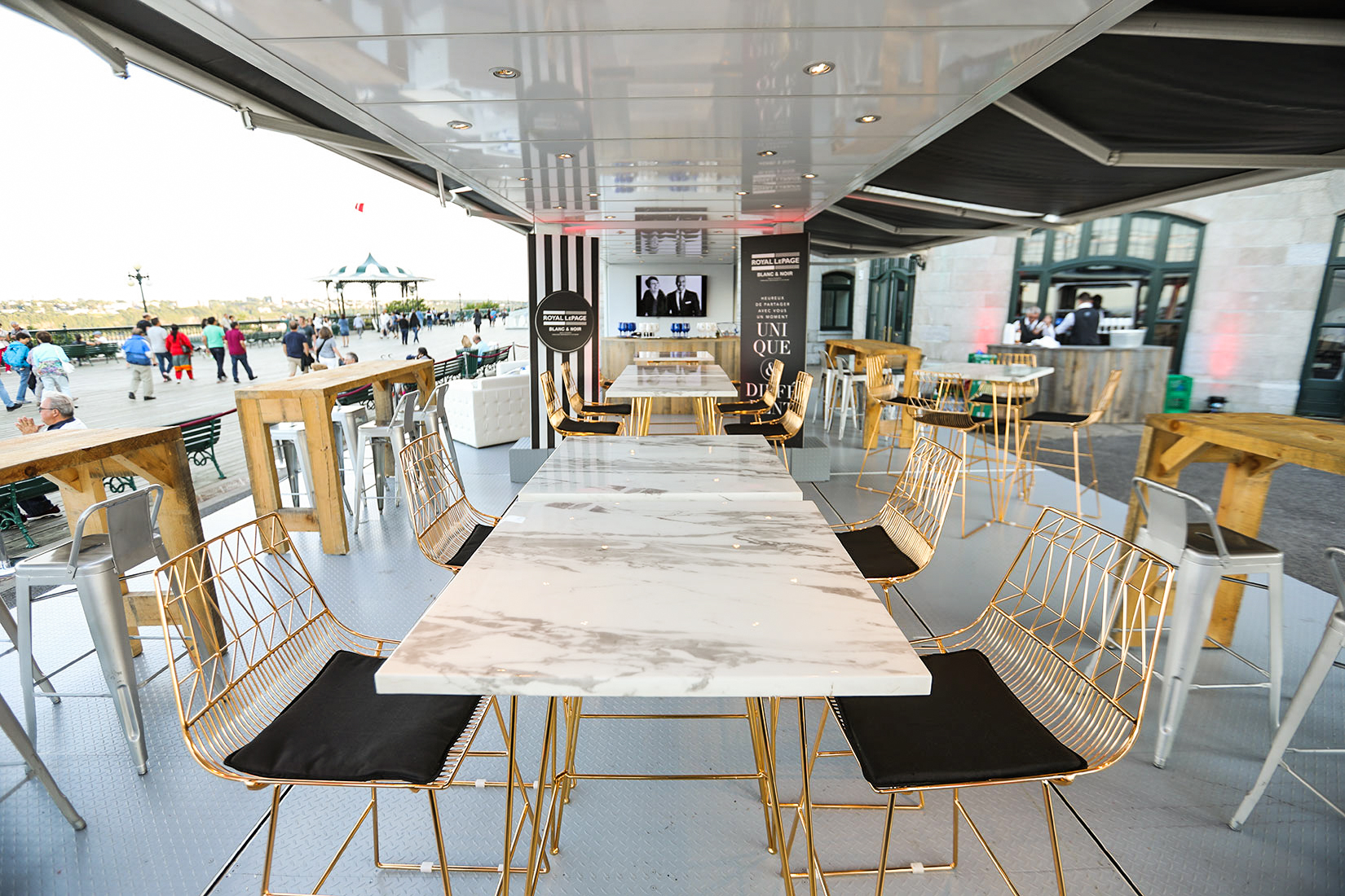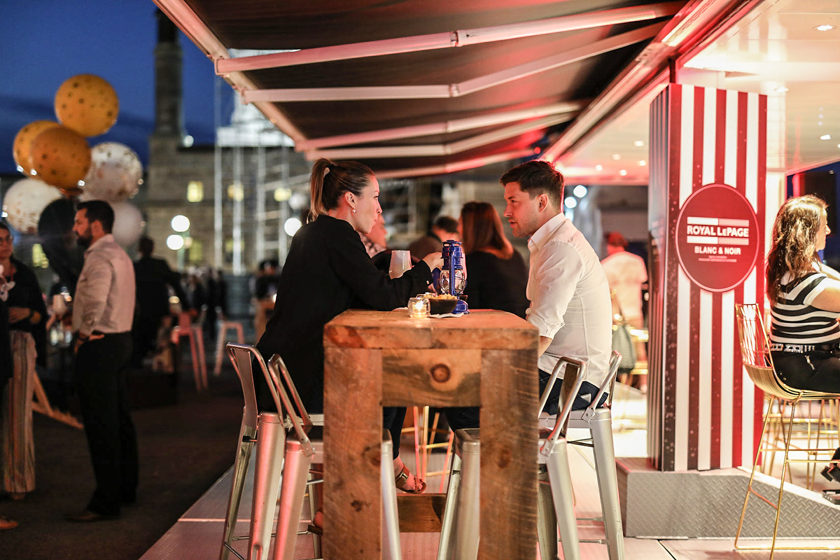 Floor extensions with awnings and satellite cocktail seating extended the pop-up bar’s footprint on the terrace. The marketing activation featured an invitation-only VIP cocktail with elegant bites to eat in a very chic atmosphere under the sultry night skies of beautiful Quebec City.