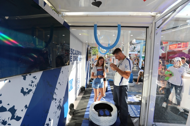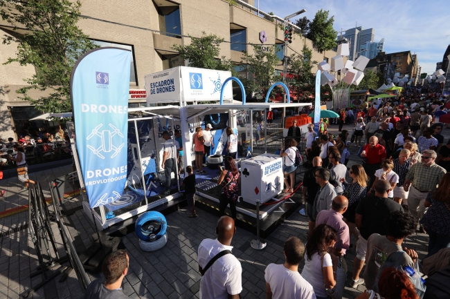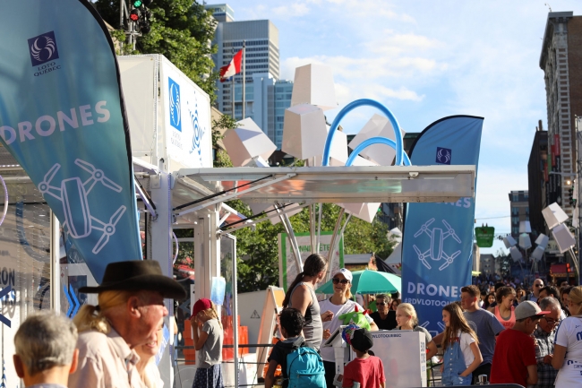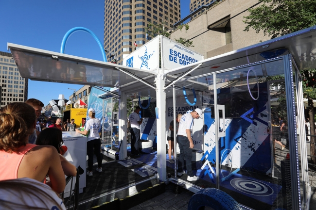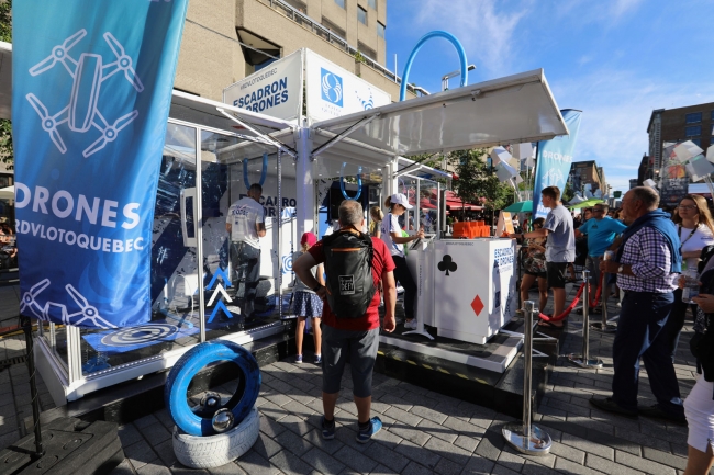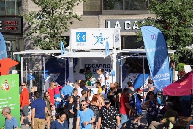 Loto Québec made a whole lot of impact with not a whole lot of box at the summer’s Just for Laughs Festival in Montreal. The provincial lottery agency set up in a small space right in the heart of the Quartier des Spectacles entertainment quarter just off one of the main outdoor stages. They selected a Loki LB8, our smallest unit that starts out as a compact 8’ X 8’ X 8’ cube that stretches to an impressive 16 X 24 feet when fully deployed. Attached to the unit, a glass box structure expanded the usable space even further for a very unique purpose: drone games! Visitors could have a few laughs fighting it out with their flying machines inside the safe confines of the glass enclosure.