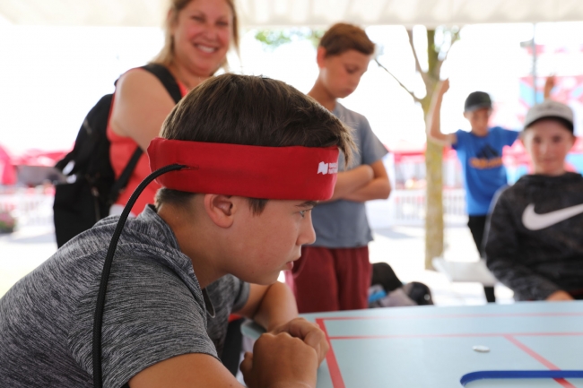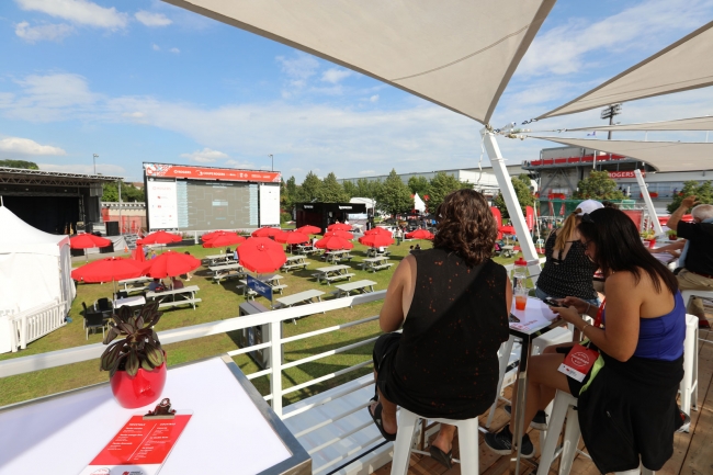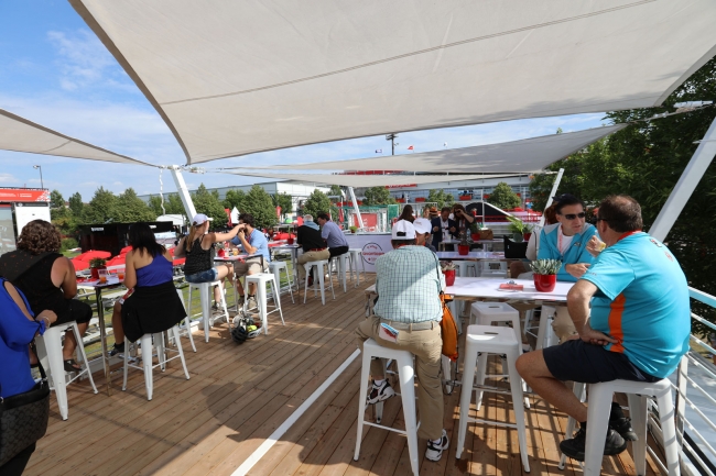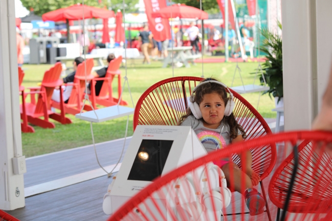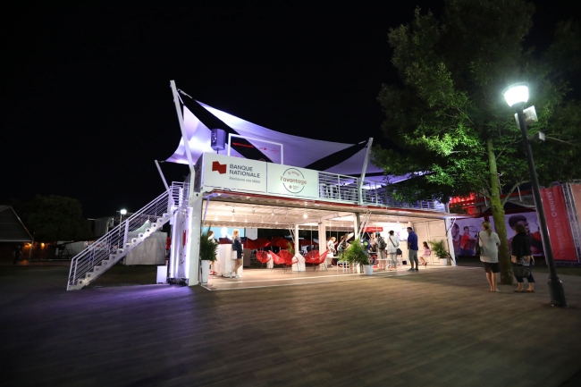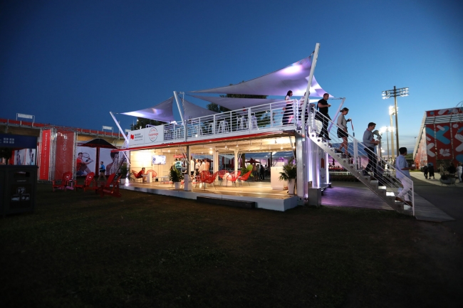 The units’ great strengths are the welcoming face they present to the public and the rich activation offering they allow: interactive games, star autograph sessions, live broadcasts, a photo booth, brain tennis and automatic teller service at the ready, plus swing sets for the kids. On the rooftop deck, the bank set up a VIP lounge with DJ and refreshment bar, all under the cool, protective covering of sunshades designed specifically for the occasion.