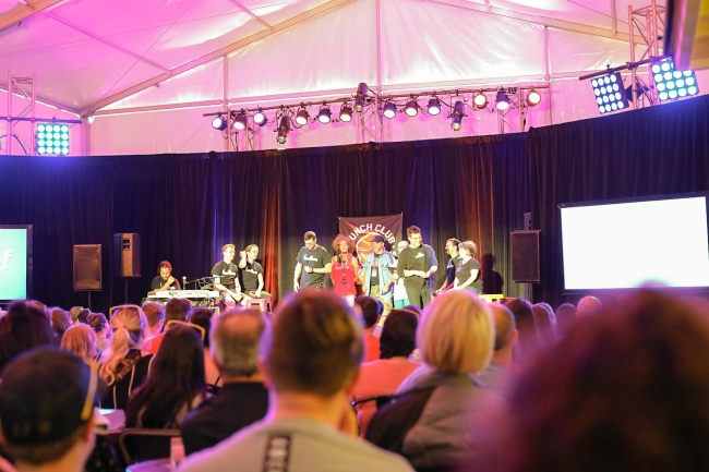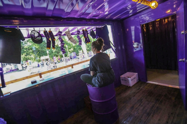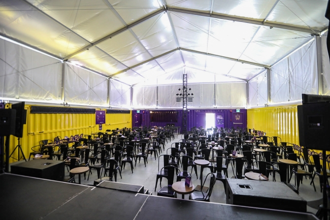 With the shipping containers painted alternating yellow and purple, the festival’s colours, the finished structure seats 216 with an inside ceiling height of 26 feet. It is air conditioned, features bar service and is affectionately nicknamed the Ha!ngar. The containers, which range in length from 20 to 40 feet, serve as dressing rooms for the performers, master control, the shop, the bar as well as entrance and exit areas. Thoughtful placement of the access doors to each container divides the open outdoor space into a seating area for customers plus other amenities inside, while production needs can all be kept separate yet accessible on the outside of the array, a huge benefit to crews and customers alike.