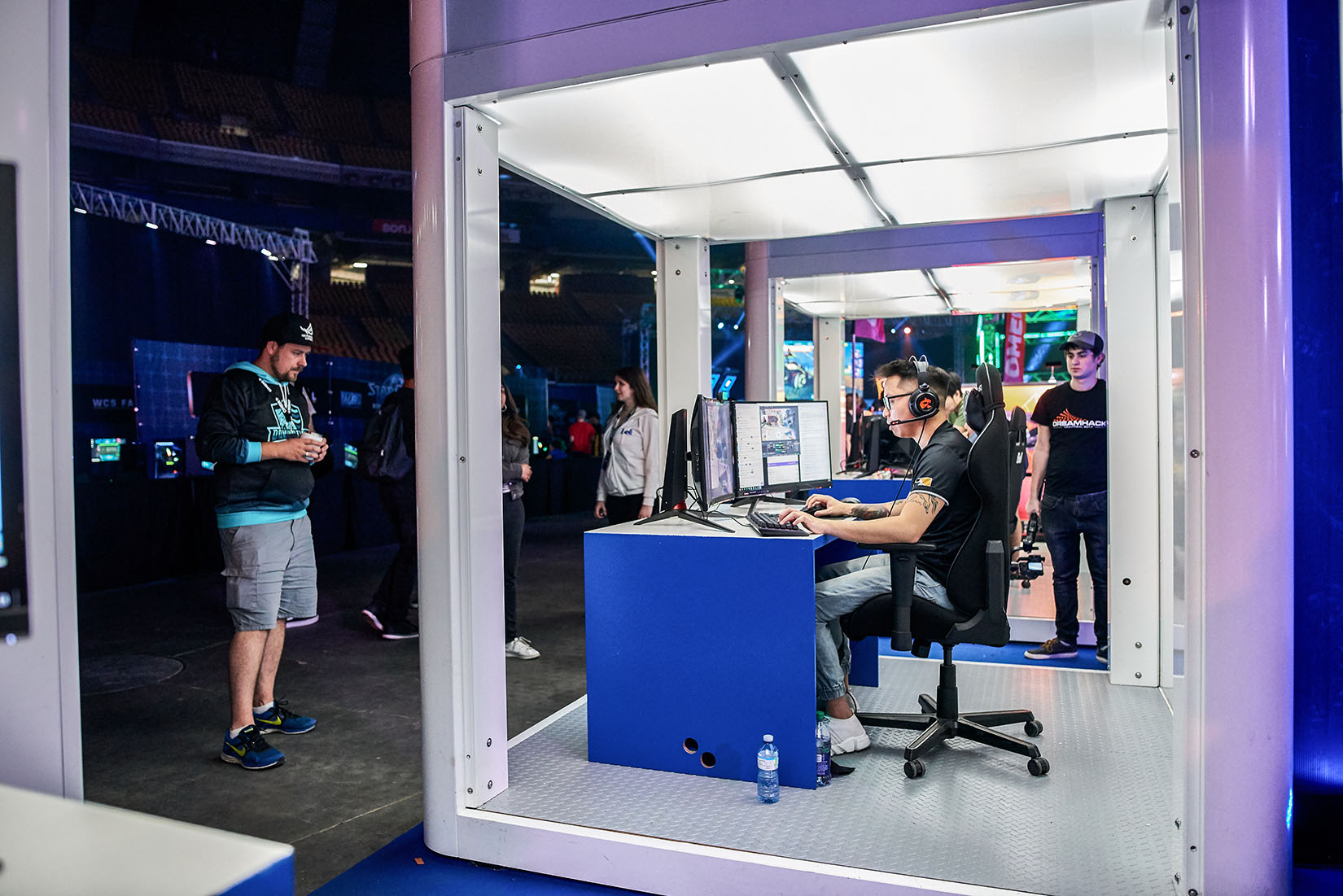 Loki provided 3 customized Loki Cube exposition booths, 8’ X 8’ units housing individual pro gamers visitors could watch at play while the action was streamed on reversed screens visible through the glass-fronted pod.